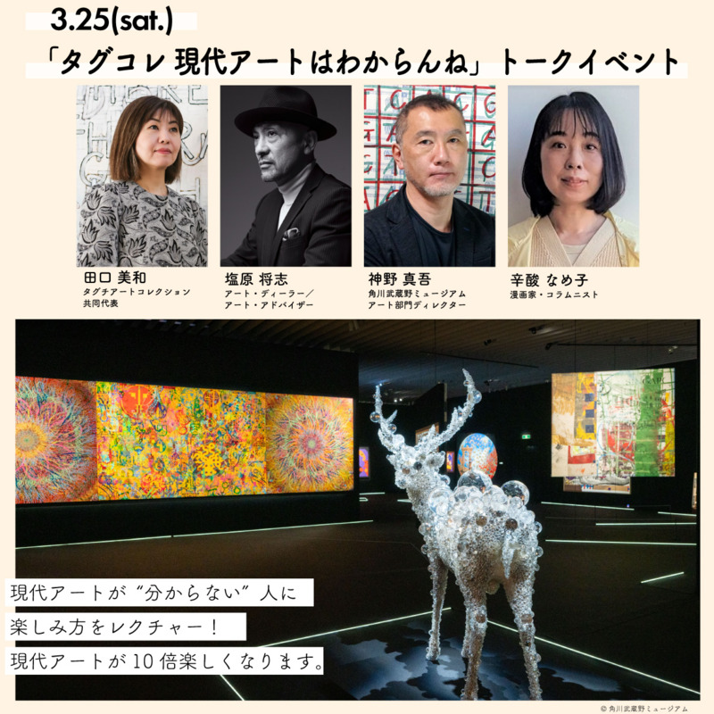 25日に開催する当トークイベントではタグコレの運営を行う田口美和氏、同コレクションのアドバイザー塩原将志氏、本展ディレクターであり美術教育の研究者である神野真吾氏、そして漫画家・コラムニストとして活躍する辛酸なめ子氏をゲストに迎え、作家のメッセージを理解するポイントやアート作品の価値が作られるシステム等を説明しながら、現代アートに関心はあるけどきっかけがつかめない…そんな方々に現代アートの楽しみ方をお伝えします。
