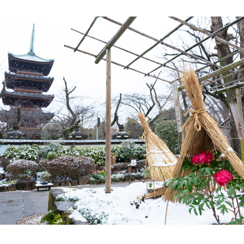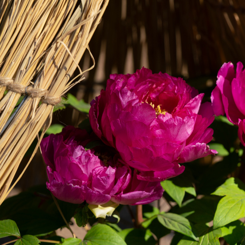霜よけの藁囲いに包まれて咲く冬の牡丹をどうぞごゆっくりとご鑑賞下さい。