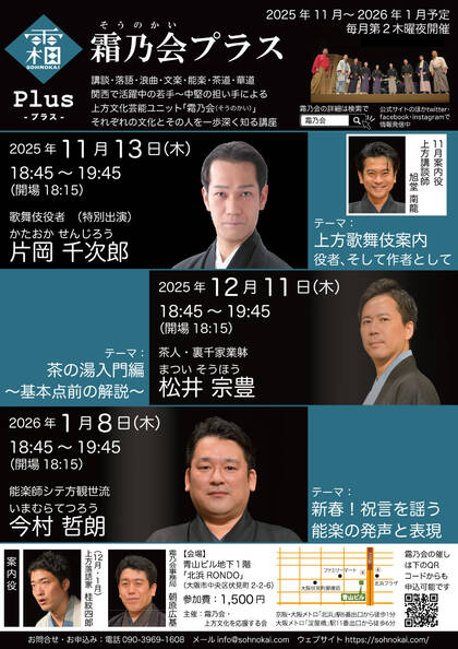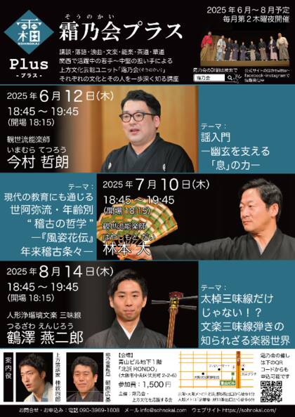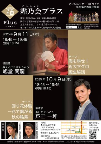 講談・浪曲・落語・文楽・能楽・茶道・華道の7ジャンル9人の上方伝統文化芸能ユニット「霜乃会」